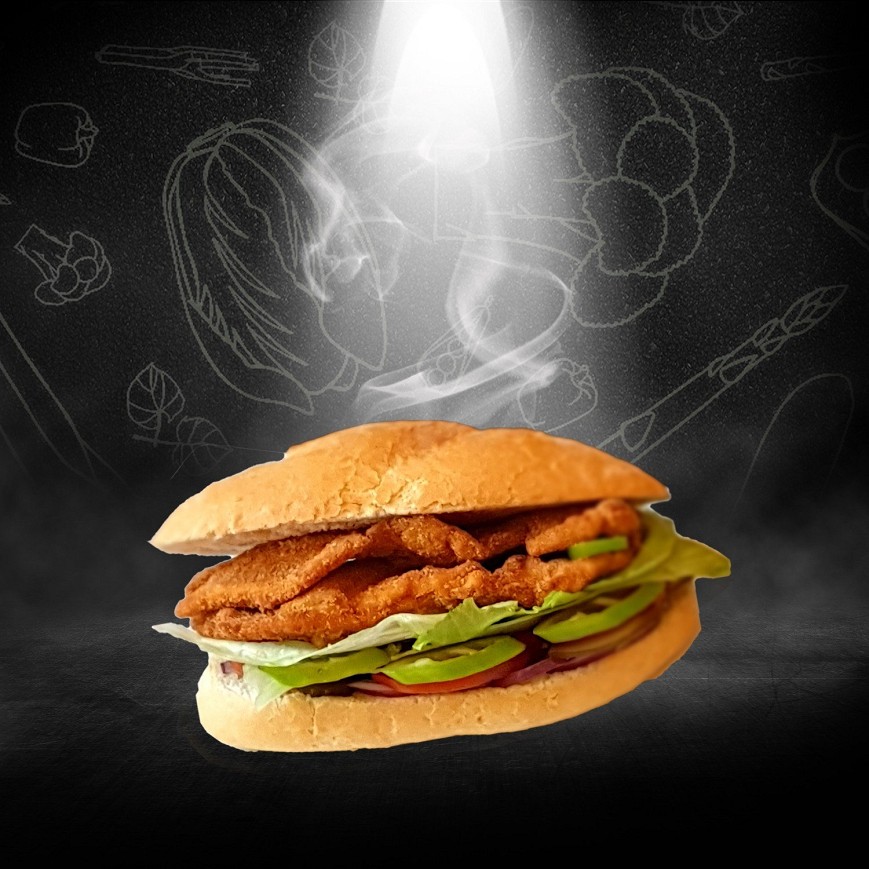 vekni, csirkemell filé, saláta, csemege uborka, hagyma, paradicsom, hegyes eröspaprika
