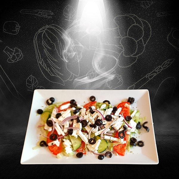 Jégsaláta, lilahagyma, kigyó uborka, paradicsom, feta sajt, fekete olívabogyó