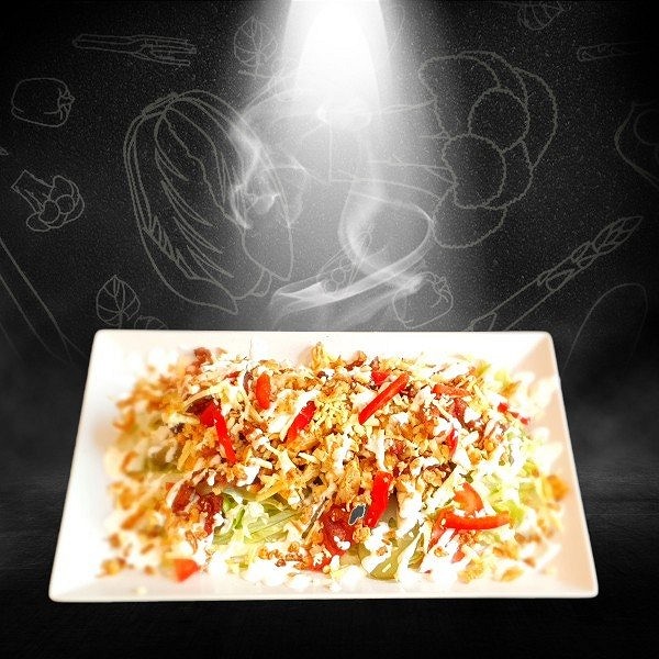 Jégsaláta, paradicsom, csemege uborka, californiai paprika, roston sült csirkemell, választható sajt: trappista, füstölt, feta vagy cheddar), pirított bacon, pirított hagyma, választható öntet