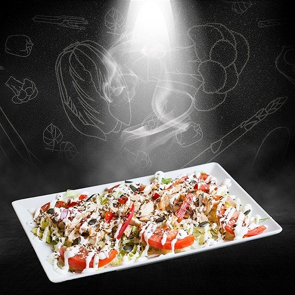 Jégsaláta, paradicsom, roston sült csirkemell, californiai paprika, joghurtos öntet, pirított magvak (lenmag, szezámmag, napraforgómag, tökmag))