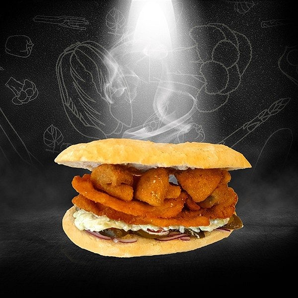 vekni, csirkemell filé, rántott gomba, csemege uborka, hagyma, paradicsom, választható: francia saláta, majonézes kukorica, vagy tzatziki