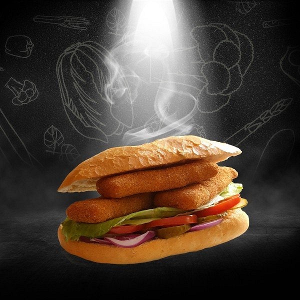 vekni, rántott sajt, saláta, csemege uborka, hagyma, paradicsom